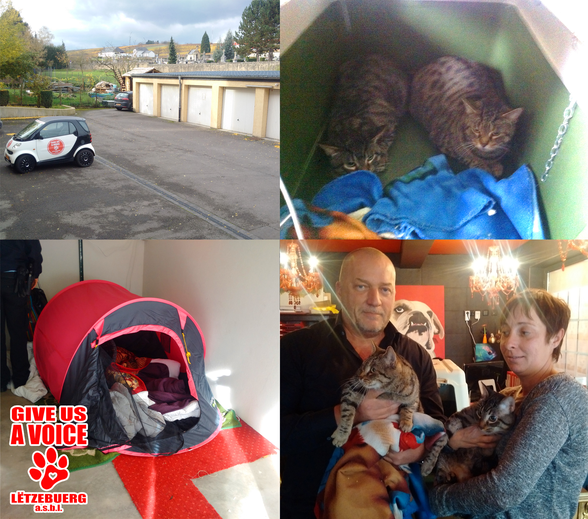 Heute Morgen wurden wir von einer Einwohnerin der route de Mondorf in Remich per Telefon informiert dass Sie während des ganzen Wochenendes verzweifeltes Miauen aus einer Garage gegenüber ihrer Wohnung hörte! Wir begaben uns selbstverständlich sofort vor Ort wo wir sofort festgestellt hatten dass die Frau sich nicht geirrt hatte! Da das Garagentore sich nicht öffnen ließ, haben wir die lokale Polizei Station angerufen, welch auch kurz danach Beamte zu uns entsendeten. Letztere haben daraufhin das Torschloss mit Gewalt geöffnet. Vor unseren Augen sahen wir, gefangen gehalten in einem geschlossenen Zelt, in einem kalten, dunklen Raum, zwei ängstliche, am ganzen Leib zitternde Kätzchen, welche in ihren Exkrementen lagen! Ein Freiwilliger von GIVE US A VOICE hat die Katzen auf der Stelle zu einem Vieh Arzt zwecks Untersuchung gefahren. Das Schicksal dieser armen Katzen liegt jetzt in den Händen der Justiz. Von unserer Seite ein aufrichtiges Dankeschön an die Beamten der Polizei Remich für Ihren prompten Eingriff!