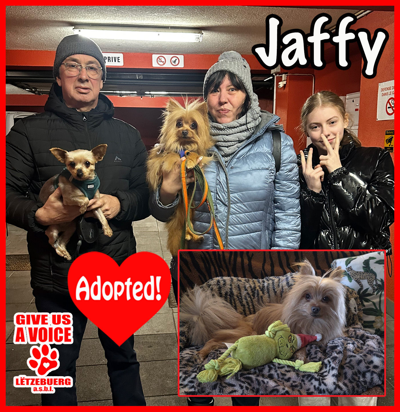 Guess who found a family?! Jaffy! Jaffy went from being abandoned on the streets of Malta to being part of the loving Ourth family. GIVE US A VOICE would like to give a big THANK YOU to this big-hearted family for giving Jaffy a second chance at happiness. Jaffy is lucky enough to join Mila, also adopted from our association, and together they are living the doggie dream! THANK YOU! THANK YOU! THANK YOU!