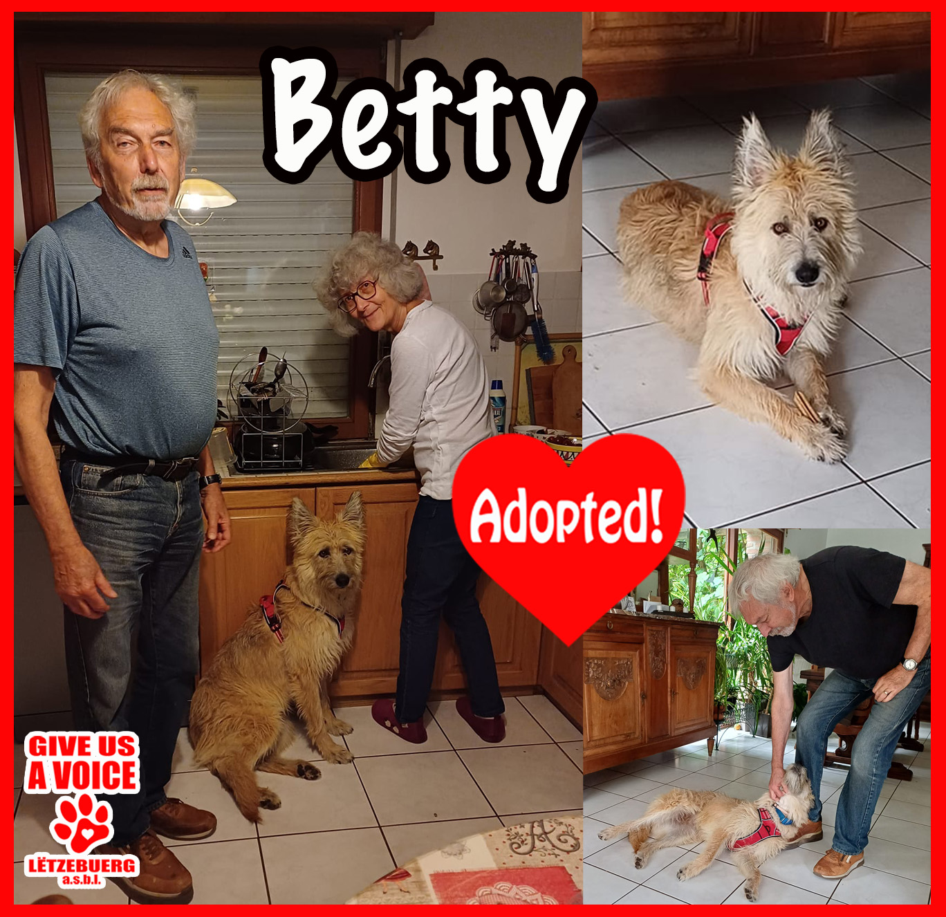 GIVE US A VOICE is absolutely thrilled to report that Betty is adopted! This sweet girl came all the way from Romania where she spent years waiting for a forever home. Betty hit the jackpot when she ended up in the home of the wonderful Petit family. We would like to give the Petit family a big THANK YOU for giving Betty the loving home she deserves. We know she can look forward to a long and happy life. THANK YOU! THANK YOU! THANK YOU!