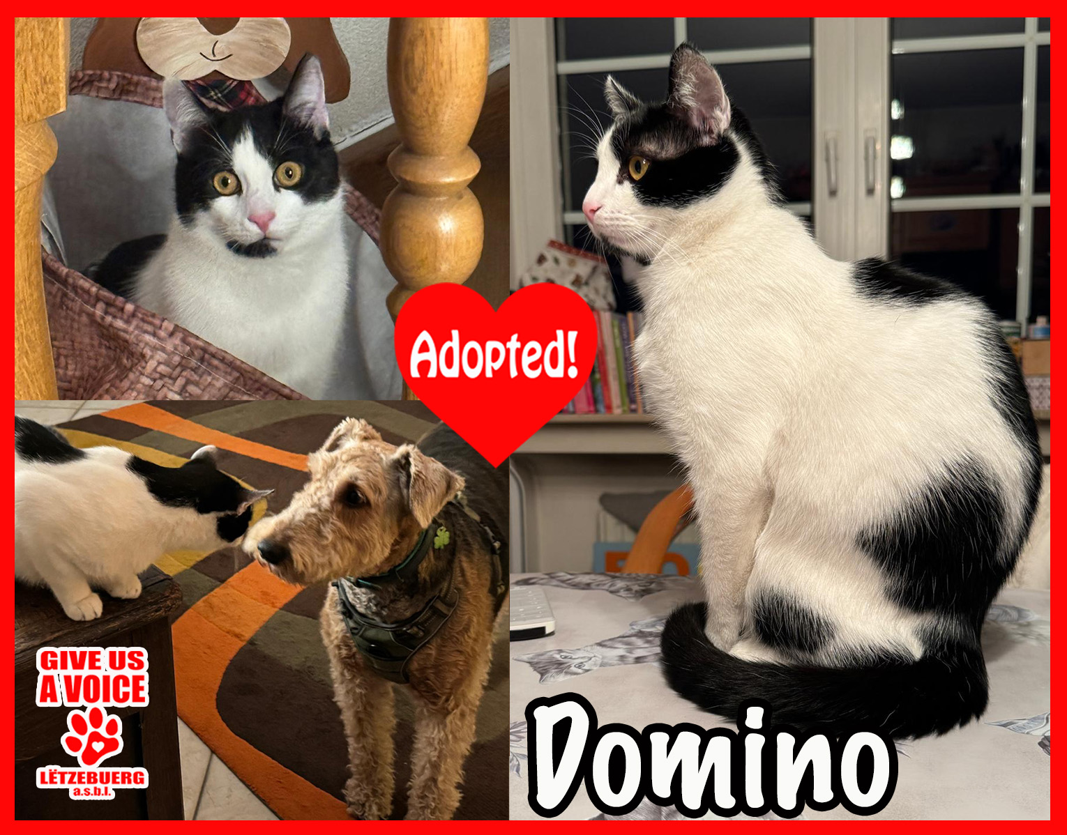 Super, great news: Domino is adopted! This pretty kitty came all the way from Romania and into the loving arms of Mme. Sandra Majerus. GIVE US A VOICE would like to give a big THANK YOU to Mme. Majerus for deciding to adopt and not shop. We know Domino is living the kitty dream and can look forward to a long and happy life. THANK YOU! THANK YOU! THANK YOU!