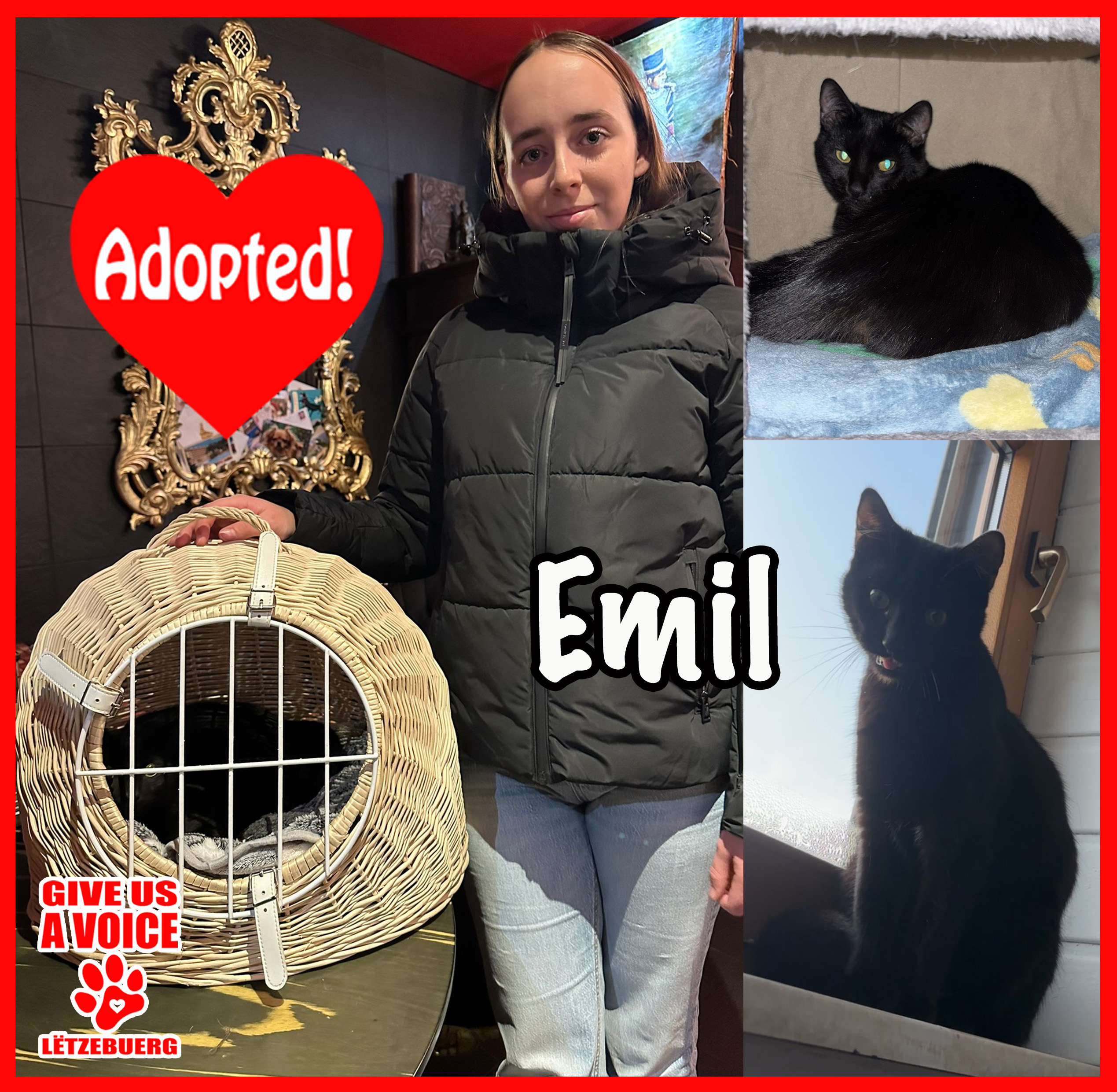 We have the puurrfect news: Emil is adopted! This fantastic feline hit the jackpot when he was adopted by the lovely Ackermann Family. GIVE US A VOICE would like to give this family a big THANK YOU for deciding to adopt and not shop. We know Emil can look forward to a lifetime of love and happiness. THANK YOU! THANK YOU! THANK YOU!