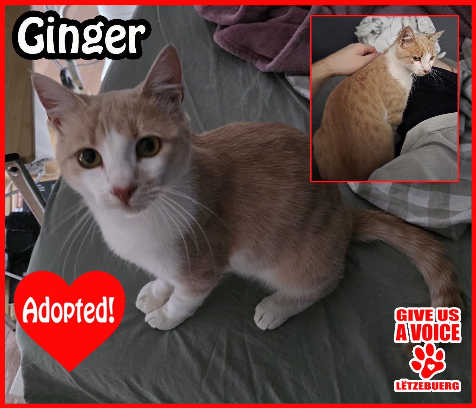 Puuurrfect news: Ginger is adopted! This sweet boy hit the jackpot when he was rescued from the streets of Romania and ended up in the home of the loving Schmit family. GIVE US A VOICE would like to give this family a big THANK YOU for deciding to adopt and not shop. We know Ginger can look forward to a long and happy life. Hooray for Ginger!