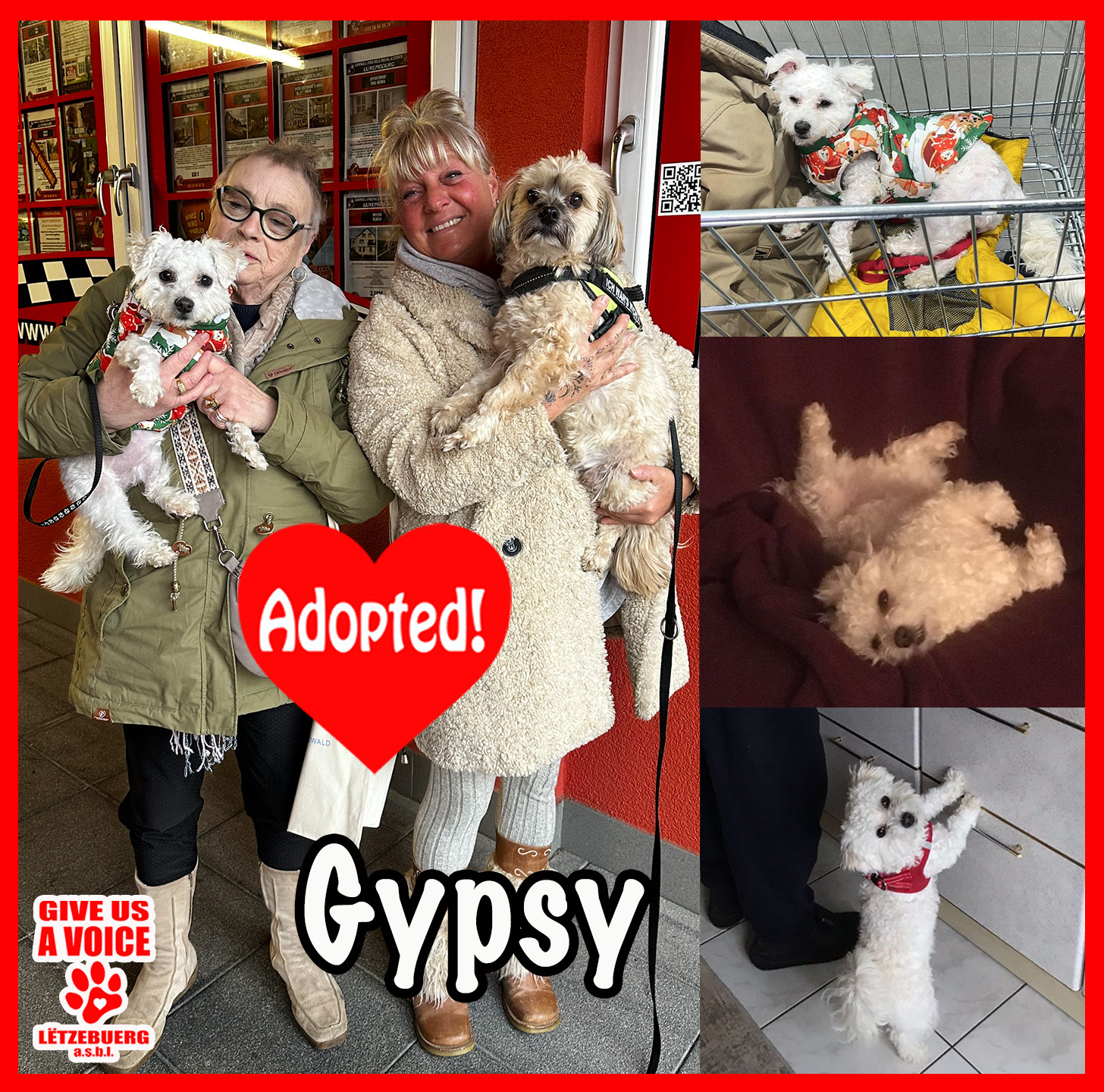 Super news: Gypsy is adopted! Poor Gyspy did not have a nice start to life but she is certainly getting her “happily ever after”. GIVE US A VOICE would like to give a big THANK YOU to Mme. Hélène May for deciding to adopt and not shop and for giving Gypsy a loving home. We know this cute little pup is finally getting the love she deserves. Thank you! Thank you! Thank you!