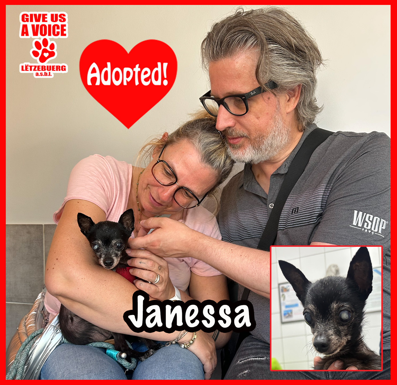 GIVE US A VOICE is thrilled to announce that Janessa is adopted. The sweet senior was abandoned at the shelter at 14 years old. In addition to being quite old, Janessa didn’t see very well and was having a hard time at the shelter. Thankfully Janessa captured the eye and the heart of the wonderful Derruau-Vandewalle who welcomed her home with open arms. We would like to give this amazing family a big THANK YOU for giving a senior dog a loving home where she can live comfortably for the rest of her life. We know Janessa is finally getting the life she deserves. THANK YOU! THANK YOU! THANK YOU!