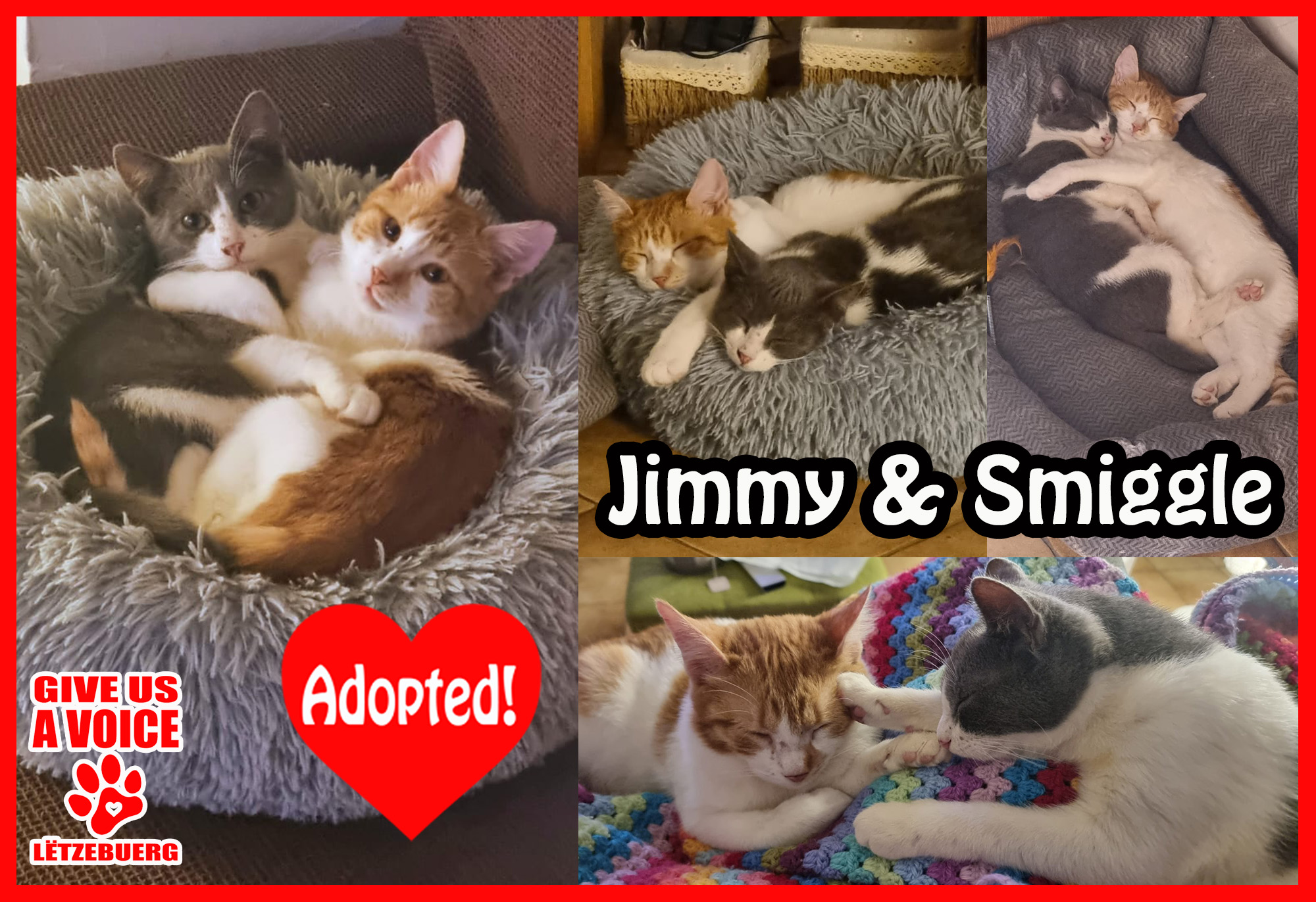 Great news: Jimmy and Smiggle are adopted! These two lucky kitties came all the way from Romania and into the loving arms of Mme. Shona MacPhail. GIVE US A VOICE would like to give Mme. MacPhail a big THANK YOU for saving, not one, but two lucky cats and giving them the loving family they deserve. It is clear they love each other and their new home. Our hearts are happy! Hooray for Jimmy and Smiggle!