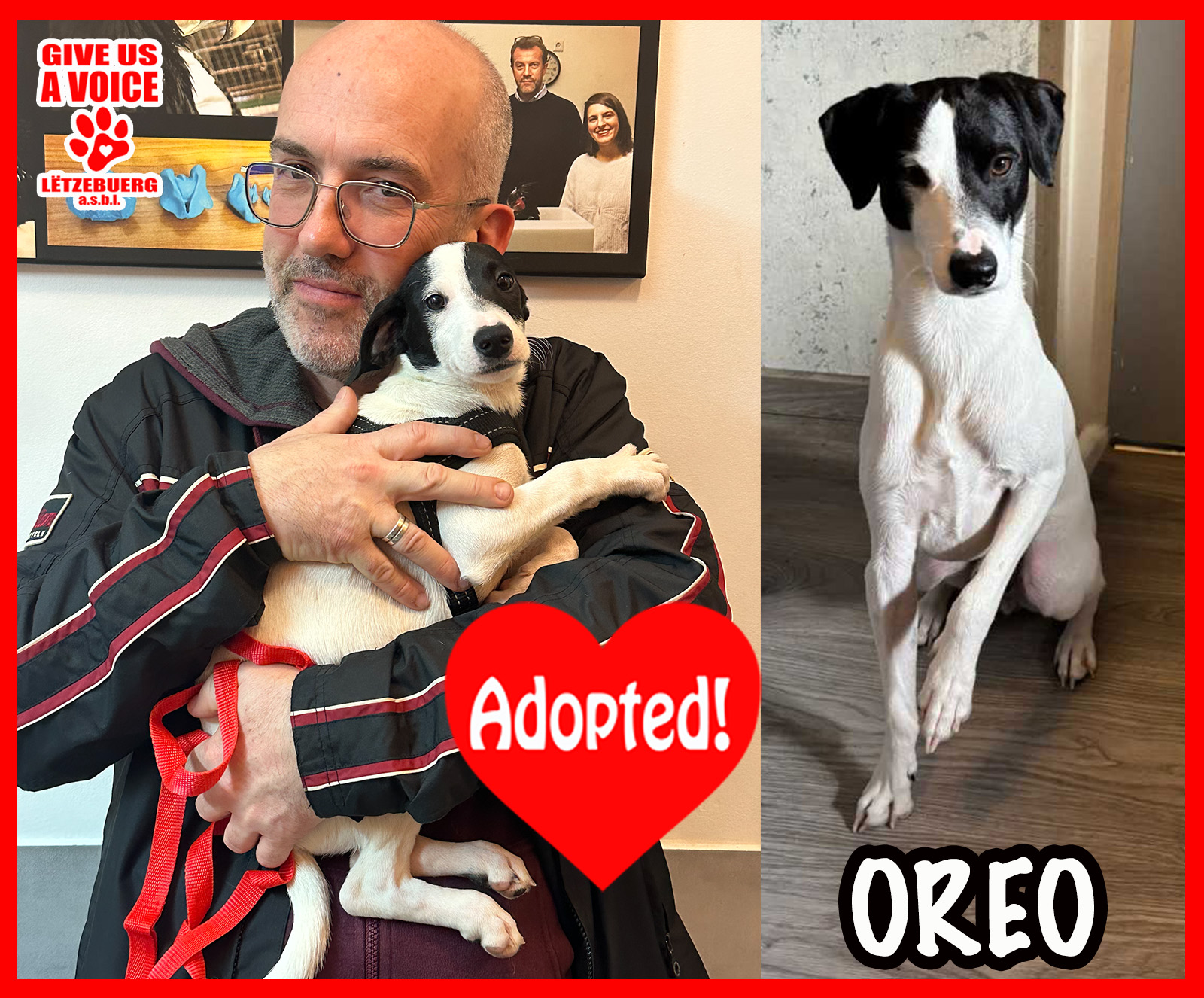 GIVE US A VOICE has great news: Oreo is adopted! This handsome boy hit the jackpot when he was adopted by the lovely Mialet family. We would like to give this family a big THANK YOU for deciding to adopt and not shop. We know Oreo is in great hands and can look forward to a lifetime of love and happiness. Hooray for Oreo!