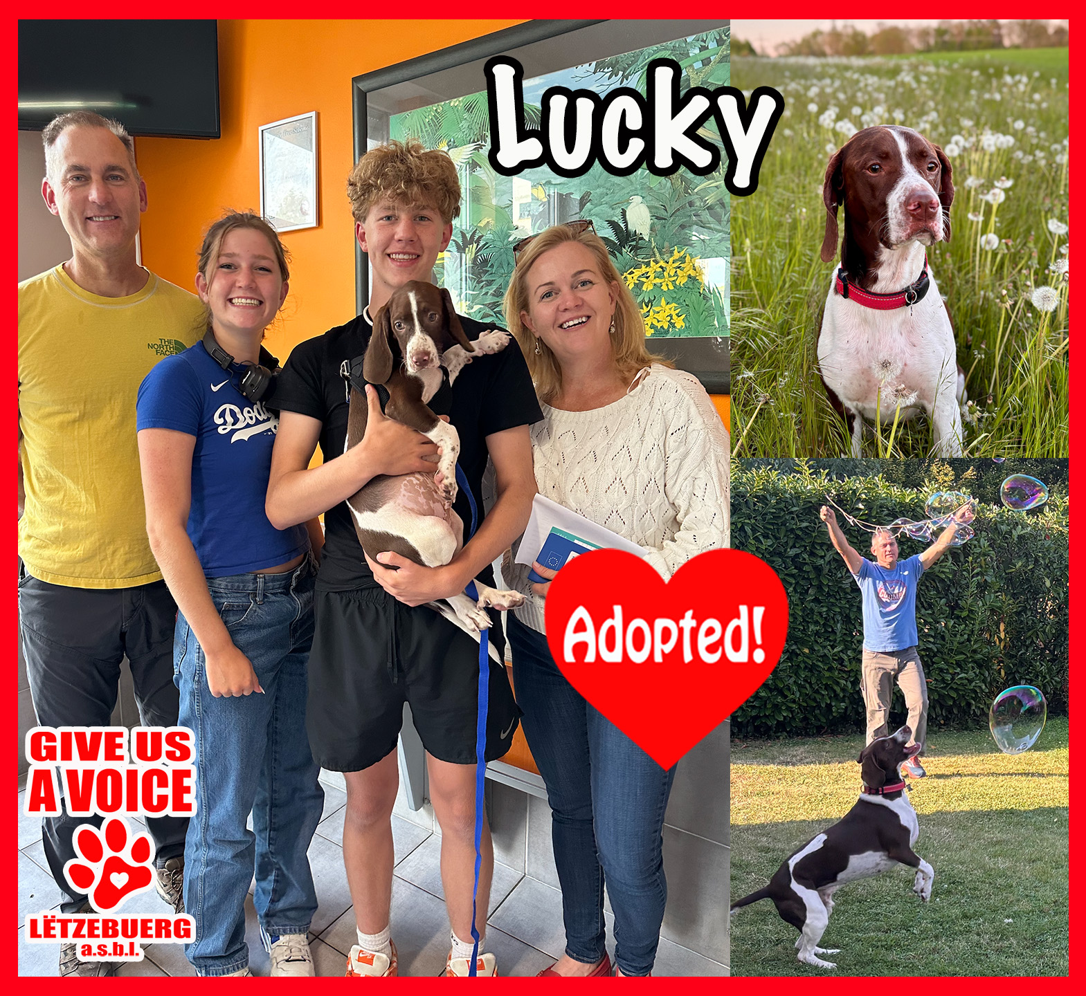Great news: Lucky is adopted! Lucky certainly got lucky when he captured the eye and the heart of the wonderful Schroeder family. GIVE US A VOICE would like to give a great, big THANK YOU for deciding to adopt and not shop. We know Lucky is living the doggie dream and can look forward to a future filled with love and adventure. THANK YOU! THANK YOU! THANK YOU!
