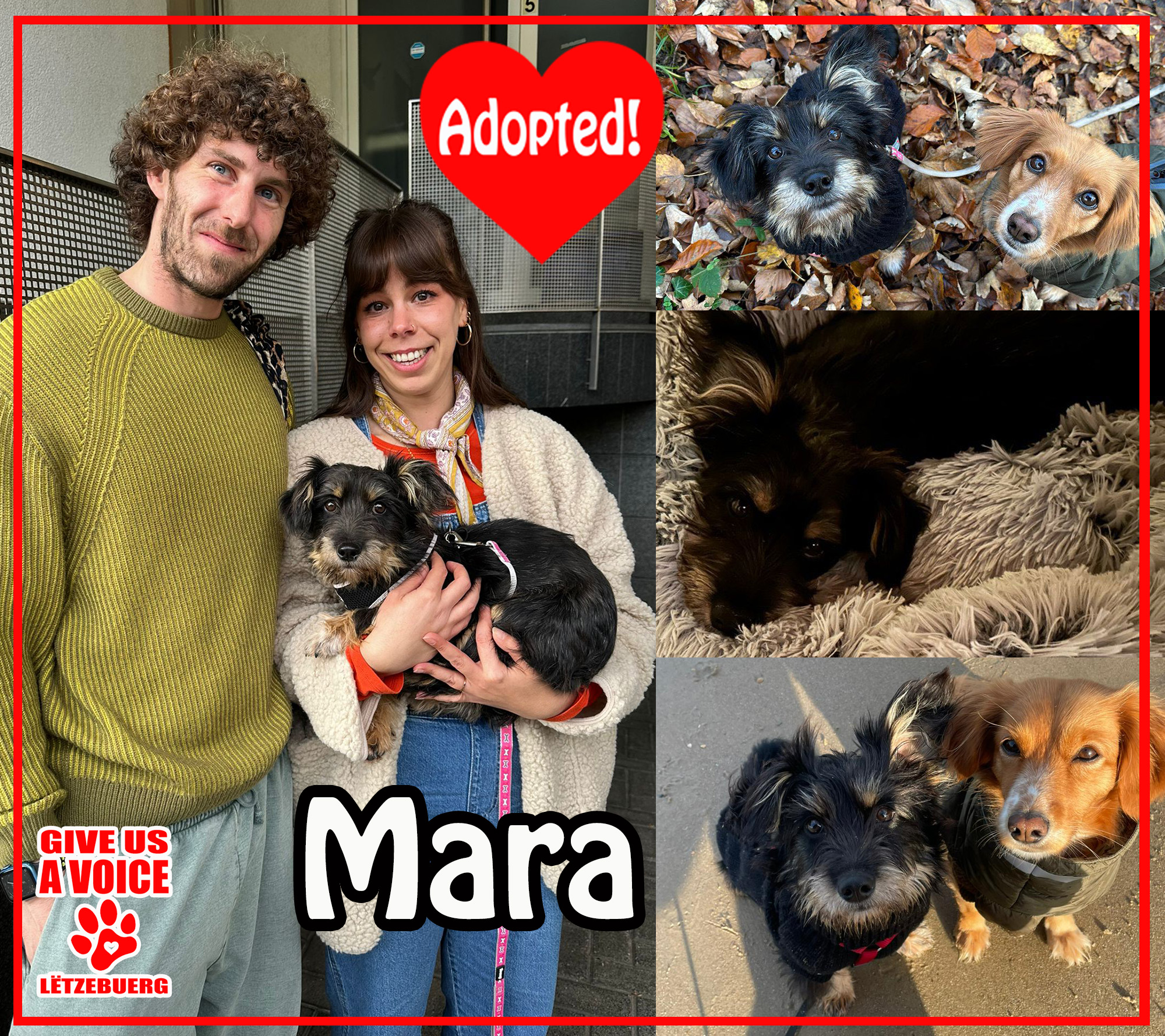 Super news – Mara is adopted! This sweet girl came all the way from the streets of Romania and into the loving arms of the Krings family. GIVE US A VOICE would like to give this family a big THANK YOU for giving Mara the loving life she deserves. Mara even had a new best friend, Suzy, to go on lots of wonderful adventures with. We know Mara is in the best hands and she can look forward to a life filled with love. Hooray for Mara!