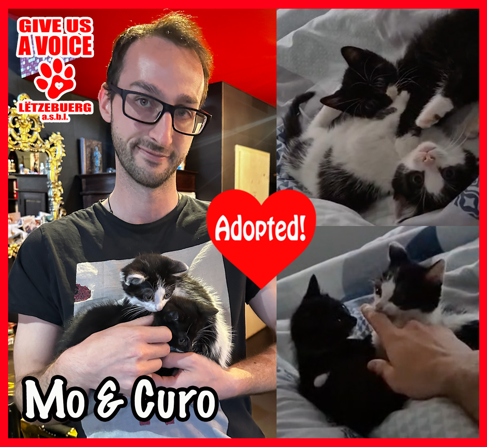 GIVE US A VOICE has great news: Mo and Curo are adopted! These two lovely kitties captured the eye and the heart of Mr. Tom Bildgen who decided to welcome them home with open arms. We would like to give Mr. Bildgen a big THANK YOU for deciding to adopt and not shop. Hooray for Mo and Curo!