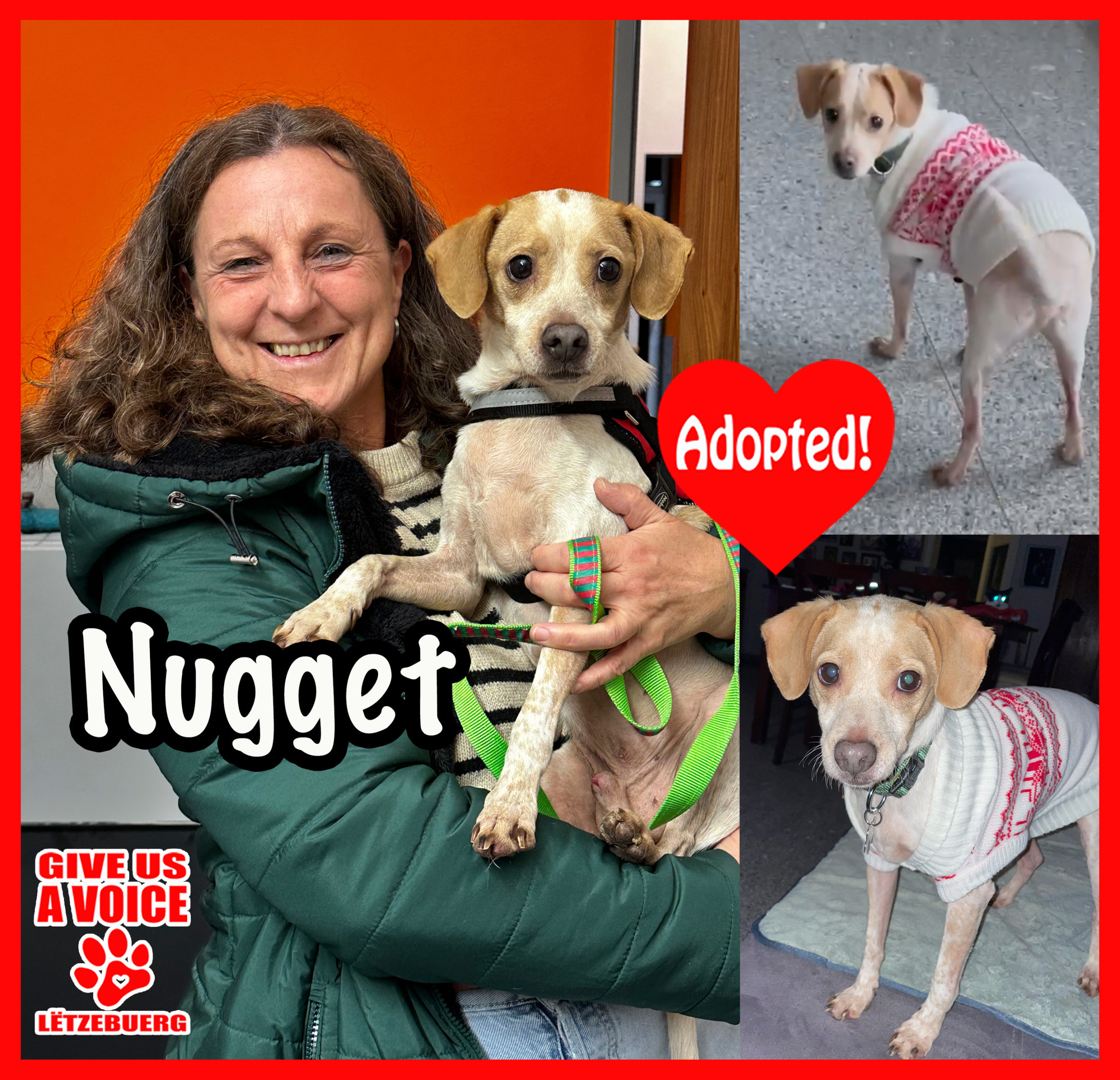 GIVE US A VOICE is thrilled to announce that Nugget is adopted! This sweet guy hit the jackpot when he captured the eye and the heart of the wonderful Mme. Marie-Jeanne Hirtt. We would like to give Mme. Hirtt a big THANK YOU for giving a shelter dog a second chance at life and a loving home. We know Nugget is in great hands and can look forward to a future filled with love and affection. THANK YOU! THANK YOU! THANK YOU!