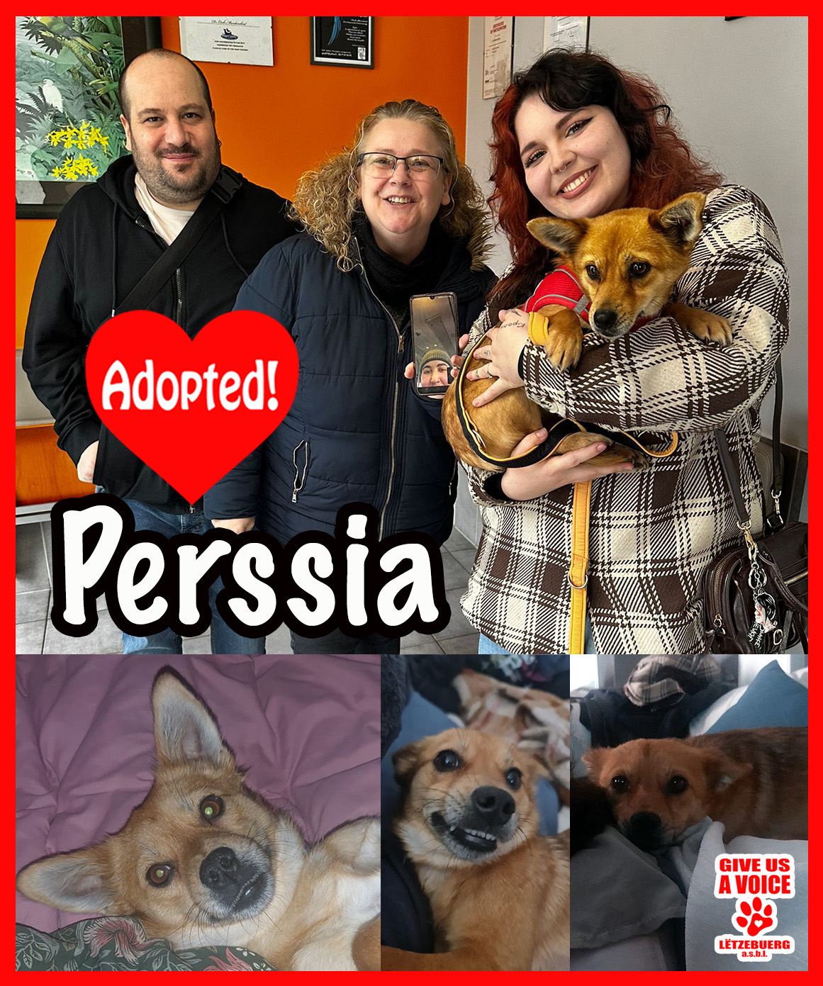 GIVE US A VOICE is proud to announce that Perssia is adopted! This lovely little dog was rescued off the streets of Romania before finding the loving home of her dreams. We would like to give a big THANK YOU to the lovely Gonzalez Velyka family for giving Perssia a second chance at life. We know she is in good hands and can look forward to a future filled with love and adventure. Hooray for Perssia!