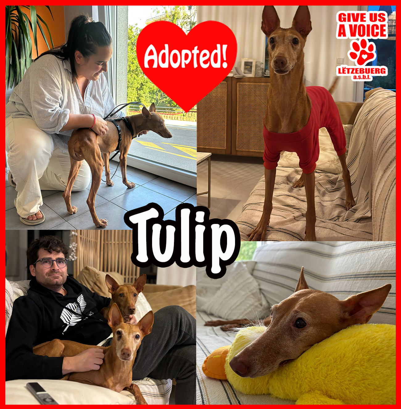 We have amazing news to report: Tulip is adopted! Tulip was found abused and abandoned on the streets of Malta before being brought to Luxembourg. We found her an amazing foster home to heal her heart and get her ready to find a forever home. Turns out, she was already home because her amazing foster family decided to become her amazing FOREVER family! GIVE US A VOICE would like to give the wonderful Pereira-Ribeiro a big THANK YOU for giving Tulip the chance of a lifetime and a forever loving home. Tulip joins Guzi, another gorgeous and majestic Pharaoh hound rescued from our association. We are so lucky to have the support of this amazing family and we know that Tulip and Guzi will live happily ever after!