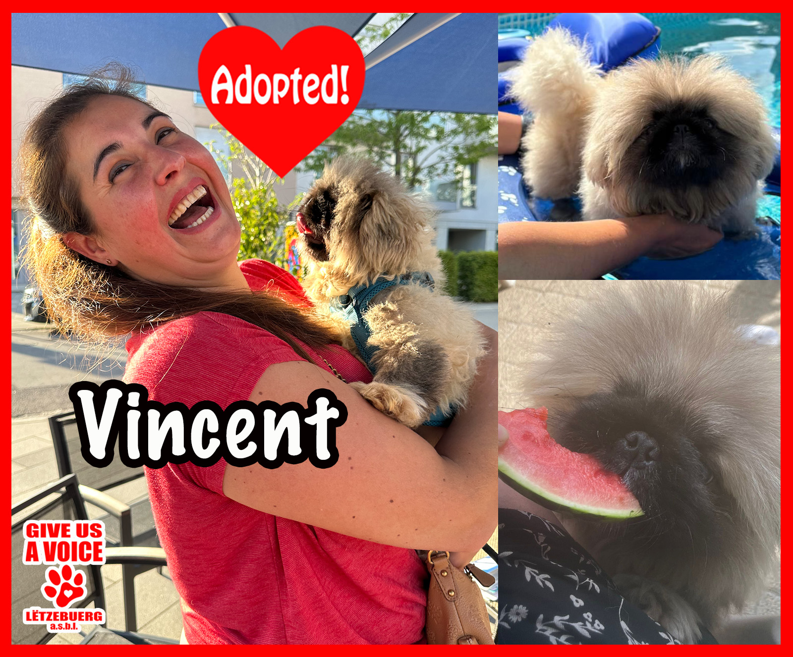 GIVE US A VOICE is thrilled to announce that Vinnie is adopted! This lucky pup hit the jackpot when he was adopted by the wonderful Mme. Hélène Rombaut. Mme. Rombaut is a big friend of our association and even adopted one of the very first dogs, Beeps, way back in 2015! We are thrilled that she has opened up her heart and home to another lovely dog in need. We know Vinnie is living the doggie dream and can look forward to a long and happy life. THANK YOU! THANK YOU! THANK YOU!